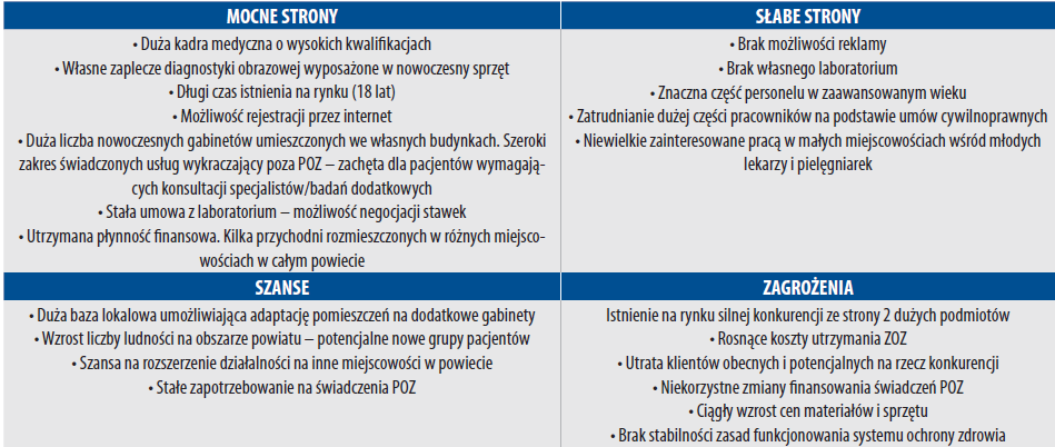 Po przeprowadzeniu analizy i odniesieniu liczby sprawozdanych w pierwszym kwartale roku 2016 badań diagnostycznych w ZOZ w porównaniu do lat poprzednich w Polsce, można stwierdzić, iż wykonywalność badań w opisywanym ZOZ w odniesieniu do poziomu wykonywania badań w ujęciu ogólnopolskim jest bardzo zbliżona. Analiza strategiczna opisywanego Zakładu Opieki Zdrowotnej udzielającego świadczeń w zakresie podstawowej opieki zdrowotnej obejmuje analizę wewnętrzną (poprzez rozpoznanie sił i słabości) oraz poprzez ustalenie obecnych i przyszłych zmian w jej otoczeniu, analizę zewnętrzną (rozpoznanie szans i zagrożeń dla tego podmiotu), co obrazuje tab. 5.